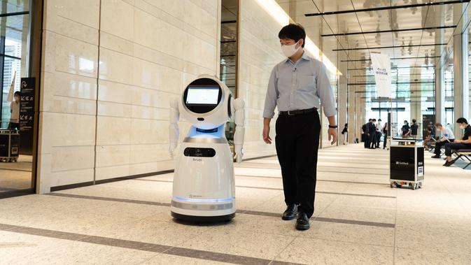 Sebuah robot memeriksa suhu tubuh seorang pria dalam uji coba yang dilakukan di sebuah bangunan komersial di Tokyo, Jepang (14/9/2020). Ajang ini untuk menguji coba cara kerja robot dalam memandu, memeriksa suhu, telepresensi, dan sejumlah fungsi lainnya. (Xinhua/Pemerintah Kota Metropolitan Tokyo)