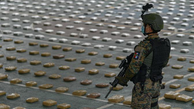 Polisi menjaga ratusan paket ganja sitaan saat konferensi pers di Markas Polisi Perbatasan Panama, Gamboa, Panama, Selasa (1/9/2020). Menurut pihak berwenang, sebanyak 758 paket ganja disita di Pantai Pasifik dekat perbatasan Kolombia. (AP Photo/Arnulfo Franco)