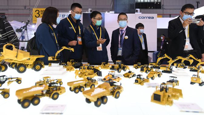 Seorang pengunjung (pertama dari kiri) mencoba alat pengukur tekanan darah di stan Omron di area ekshibisi Peralatan dalam Pameran Impor Internasional China (China International Import Expo/CIIE) ketiga di Shanghai, China timur, pada 5 November 2020. (Xinhua/Fang Zhe)